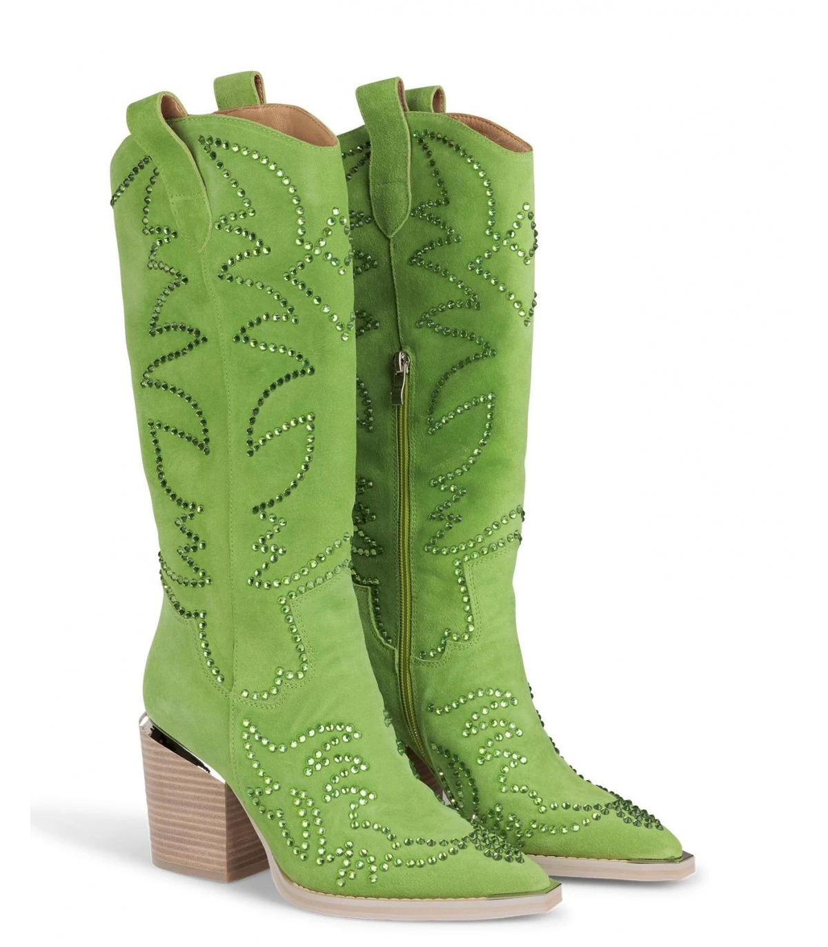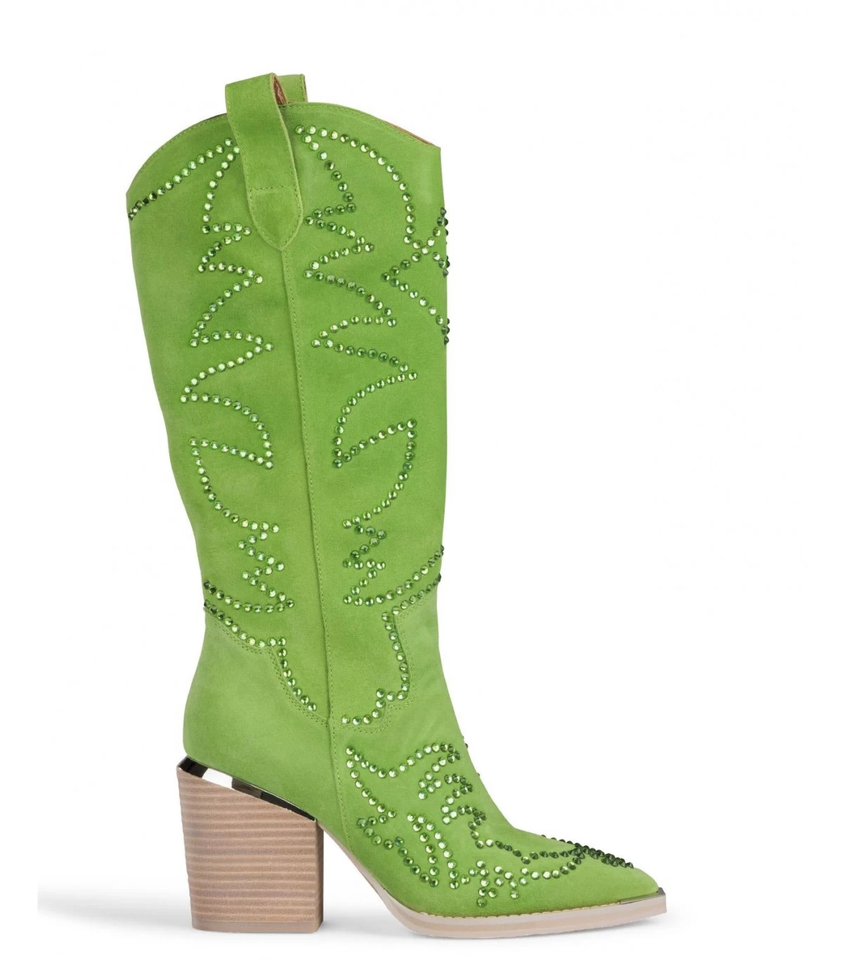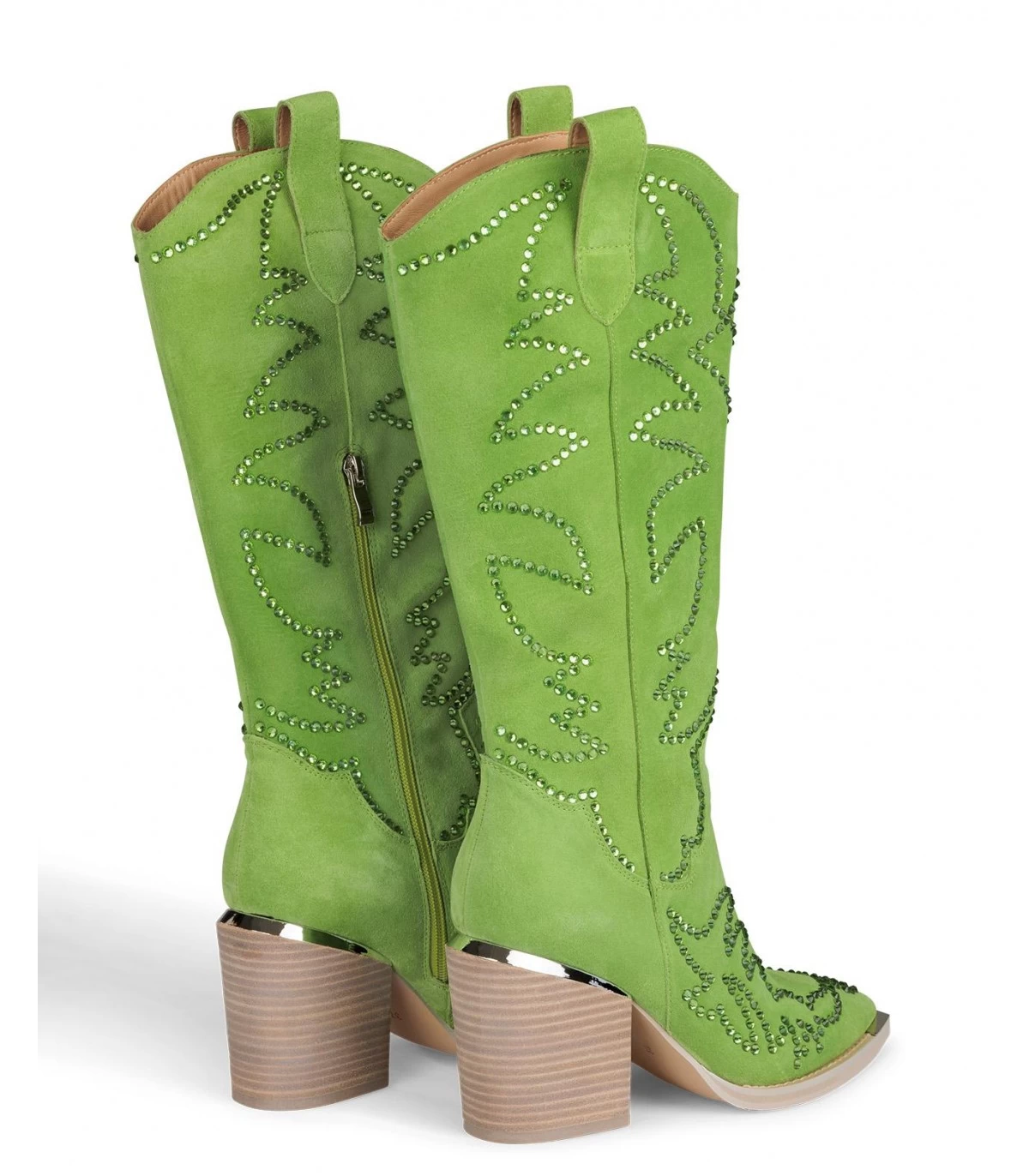 Bota de piel con pedrerÃa. El contorno de la abertura es de 32cm, la altura del tacón es de 8cm y la altura de la caña es de 30cm. Plantilla acolchada de piel.