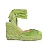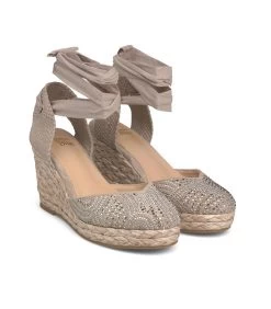 Sandalia tipo cuña de esparto trenzado con detalle de pedrerÃa en punta. Plantilla acolchada para un mayor confort. La altura del tacón es de 9,5cm.