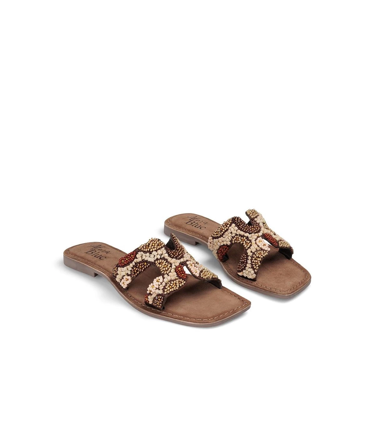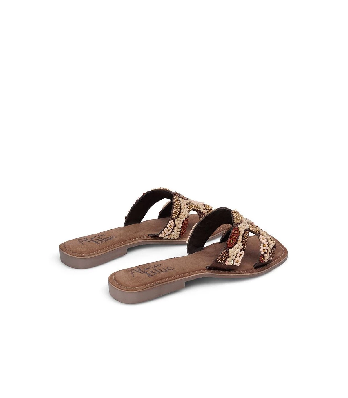 Sandalia plana con tiras de pedrerÃa y trenzados multicolor. Plantilla acolchada para un mayor confort. La altura del tacón es de 1cm.