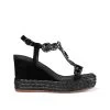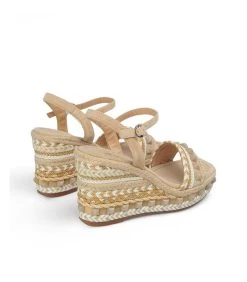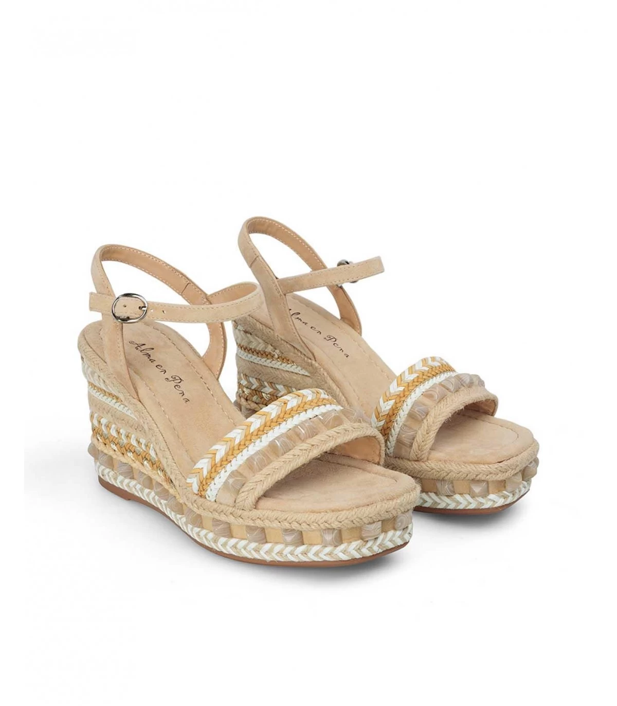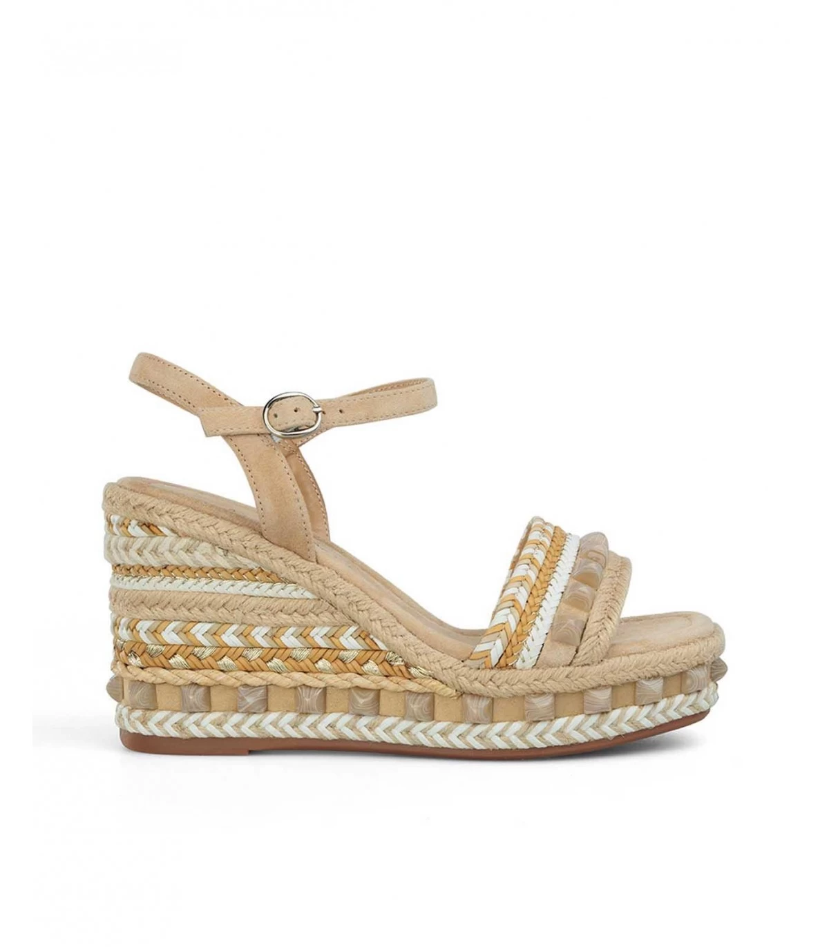 Sandalia cuña de piel con detalle trenzado y de pedrerÃa. Punta cuadrada. Suela acolchada y cierre con hebilla en tobillo y altura de tacón de 9,5cm