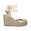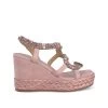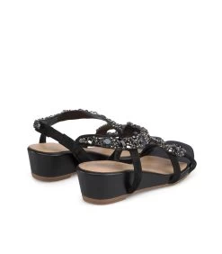 Sandalia con cuña baja de piel y punta cuadrada. Tiras cubiertas de pedrería. Plantilla acolchada. Altura del tacón de 4cm