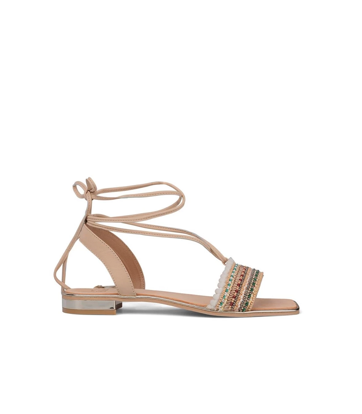 Sandalia plana con tiras de pedrerÃa y trenzados multicolor. Plantilla acolchada para un mayor confort. La altura del tacón es de 1cm.