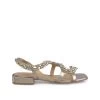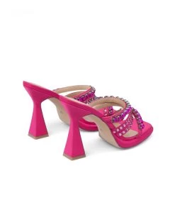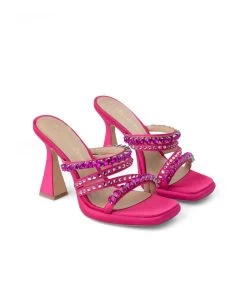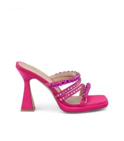 Sandalia de tacón realizada en piel con tiras delanteras cubiertas de pedrerÃa. Plantilla acolchada de piel. La altura del tacón es de 11cm.