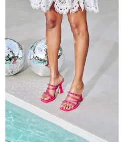 Sandalia de tacón realizada en piel con tiras delanteras cubiertas de pedrerÃa. Plantilla acolchada de piel. La altura del tacón es de 11cm.