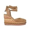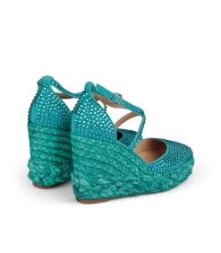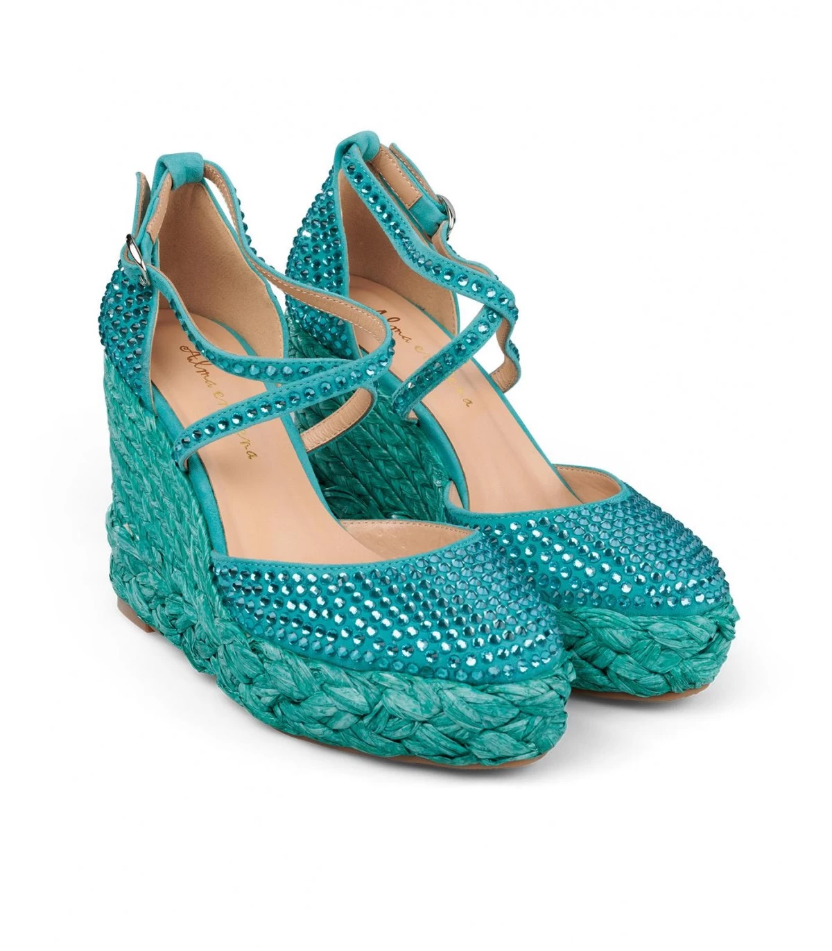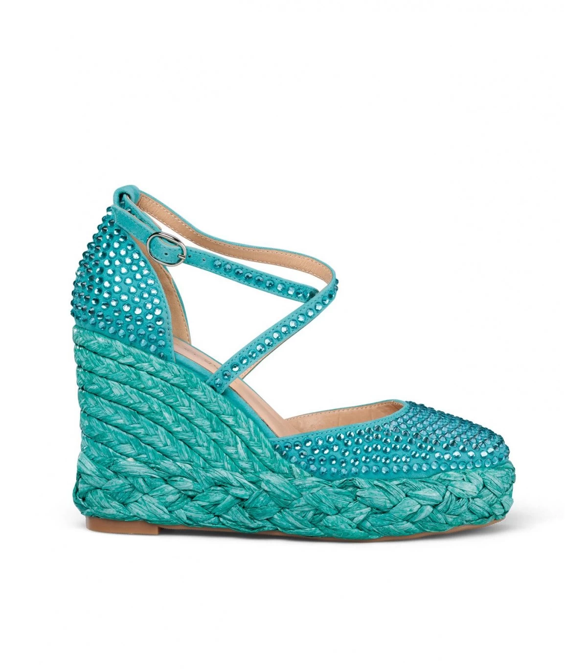 Sandalia cuña de esparto trenzado con detalle de pedrería en talón, punta y tiras. Punta redondeada. Cierre con hebilla. Cuña de piel con suela acolchada. tacón de 11cm
