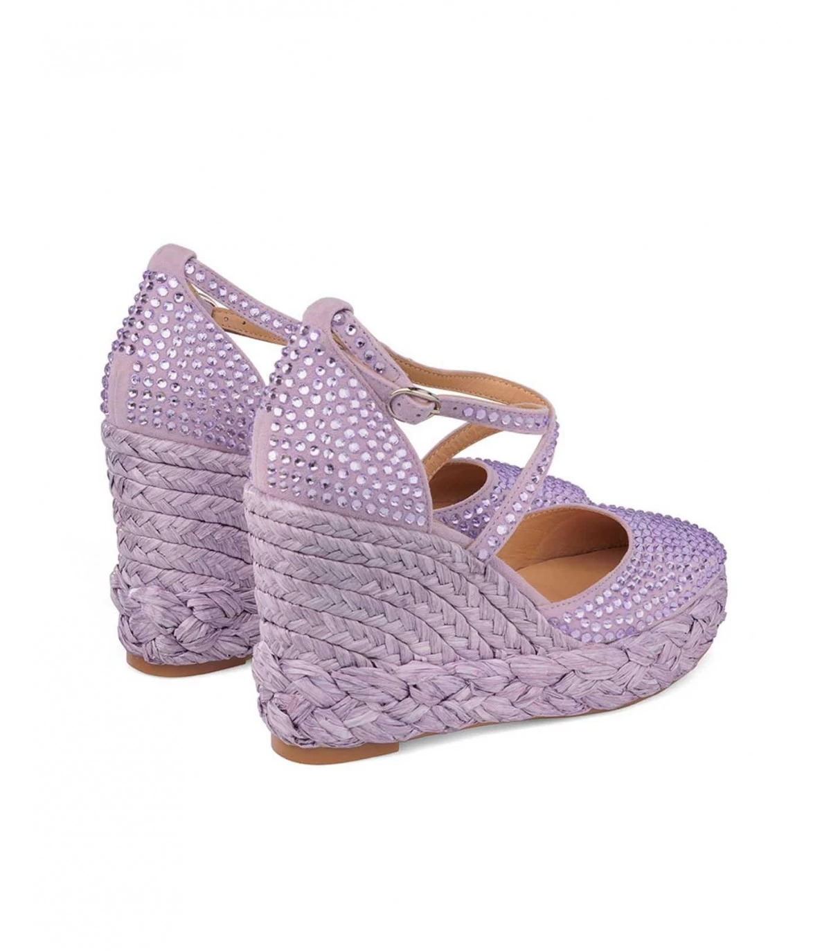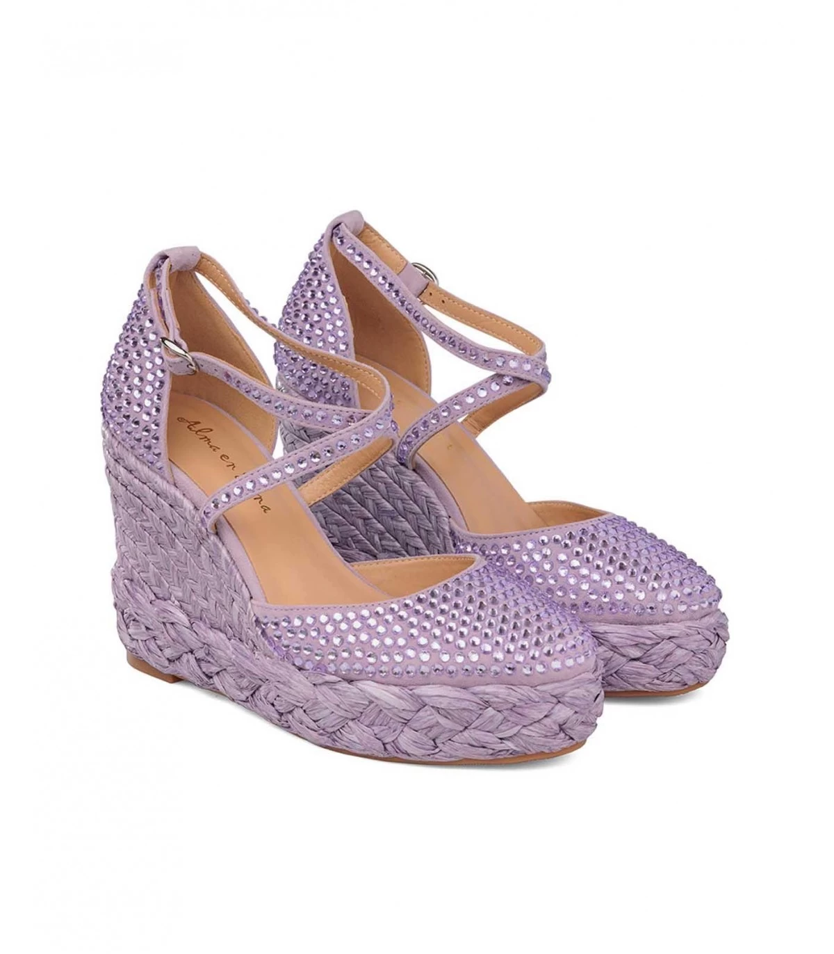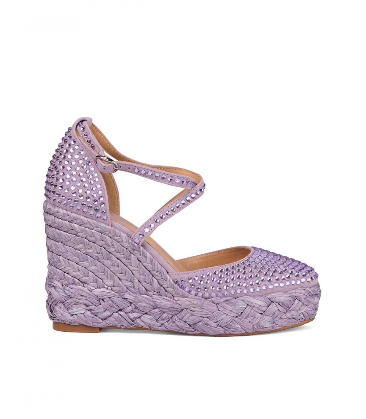 Sandalia cuña valenciana de piel con esparto trenzado con detalle de pedrerÃa en talón, punta y tiras. Punta redondeada. Cierre con hebilla y suela acolchada. Altura de tacón de 11cm