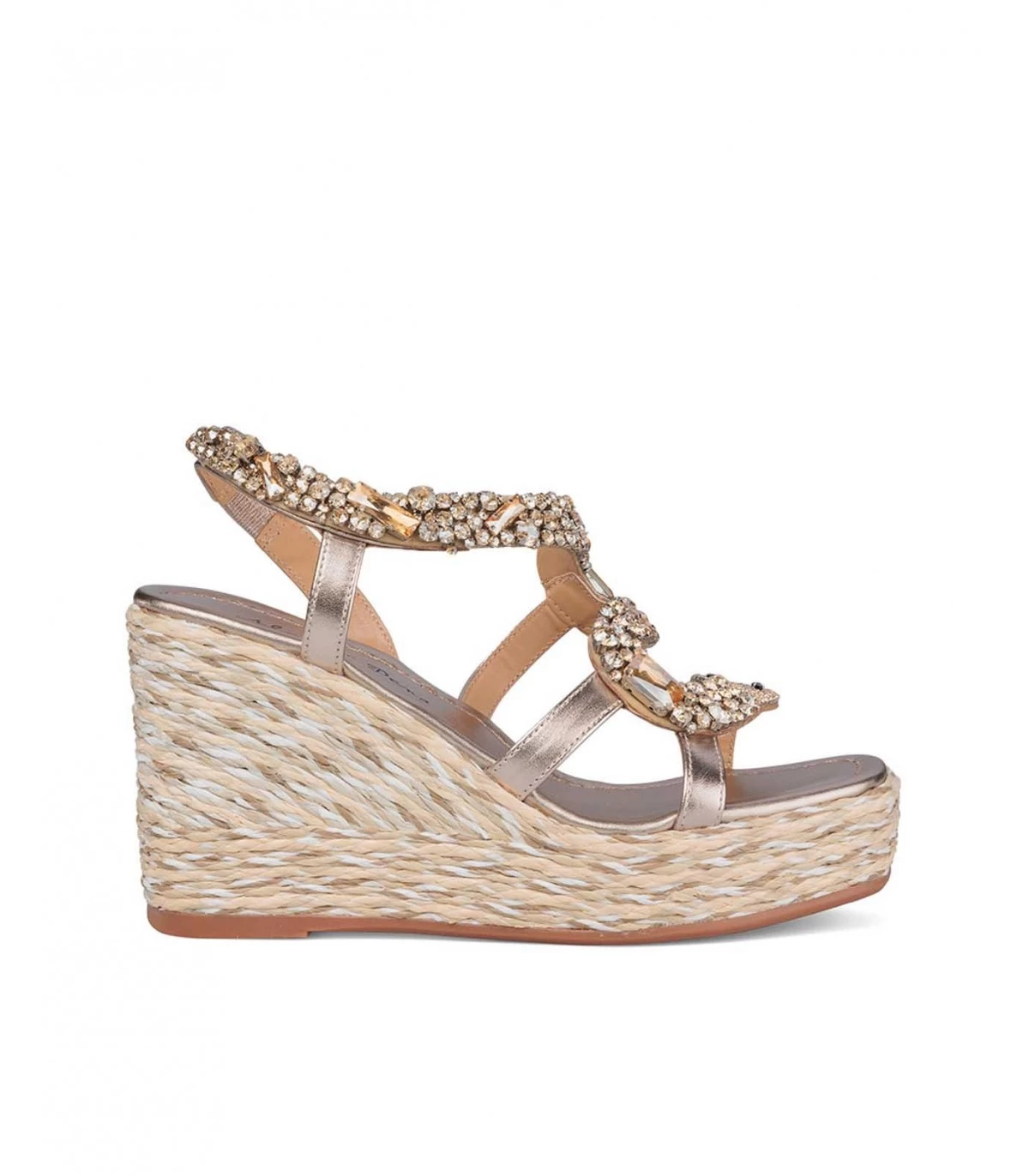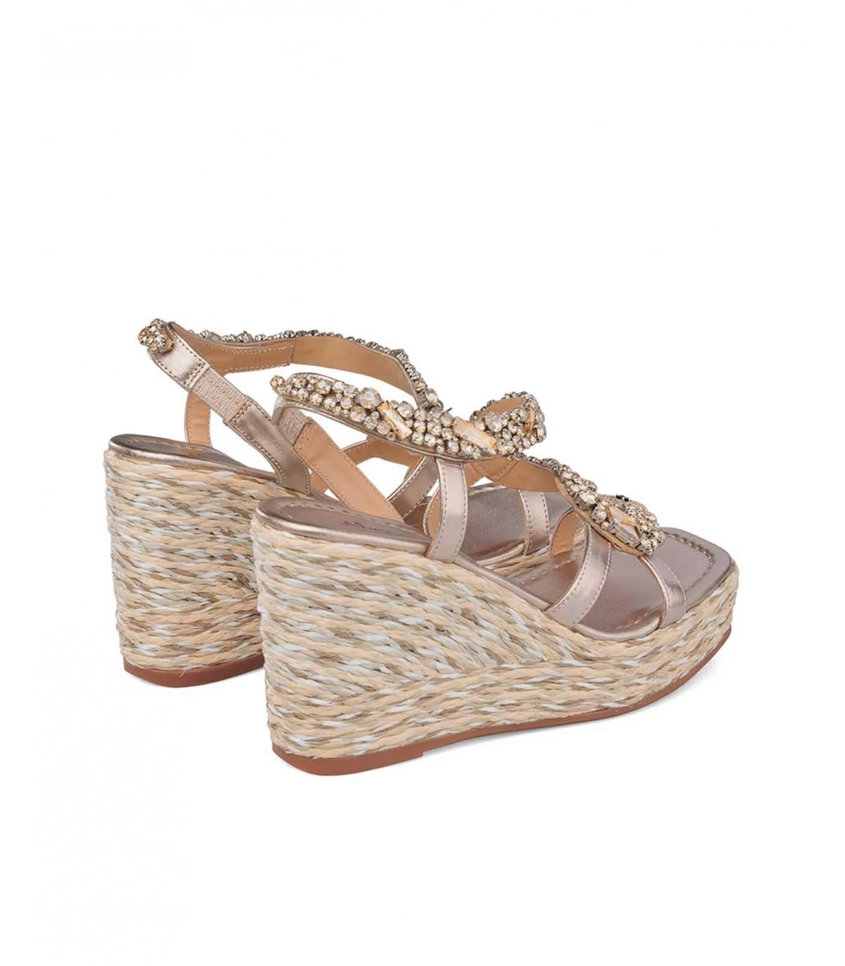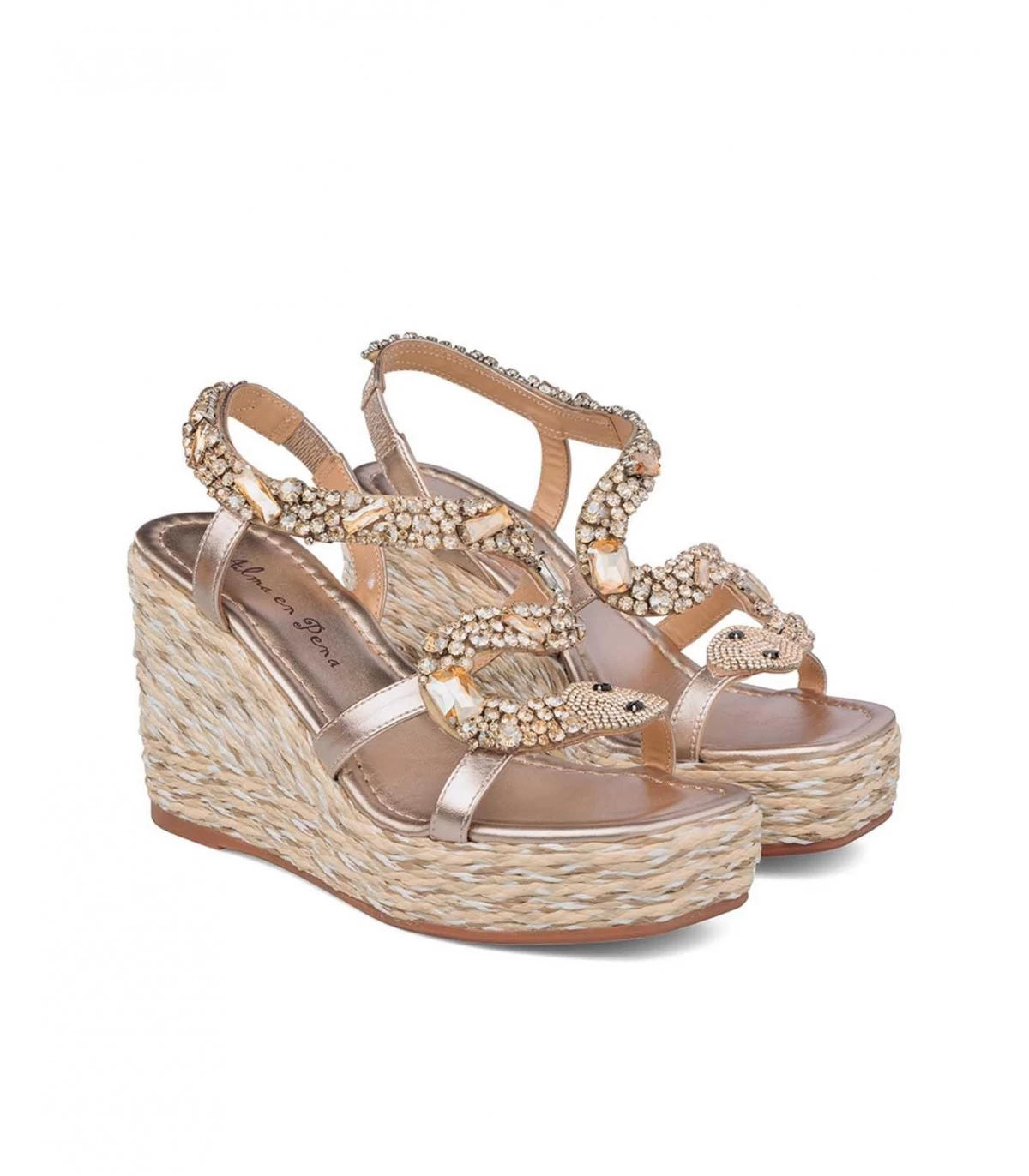 Sandalia cuña de piel con detalle de serpiente cubierta de pedrería en delantero. Punta cuadrada. Plantilla acolchada de piel. Altura del tacón 9,5cm.