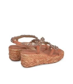 Sandalia cuña de piel con adorno de pedrería en forma de serpiente. Plantilla de piel acolchada para un mayor confort. La altura del tacón es de 6cm.
