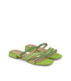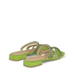 Sandalia plana de ante con tiras cubiertas de pedrerÃa. Plantilla acolchada de ante. La altura del tacón es de 1cm.