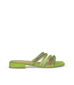 Sandalia plana de ante con tiras cubiertas de pedrerÃa. Plantilla acolchada de ante. La altura del tacón es de 1cm.