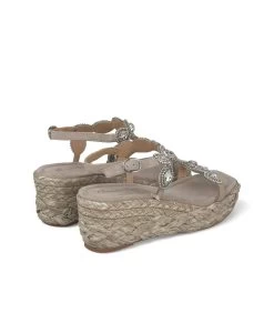 Sandalia tipo cuña con adornos de pedrería. Plantilla de piel acolchada para un mayor confort. La altura del tacón es de 6cm.