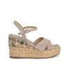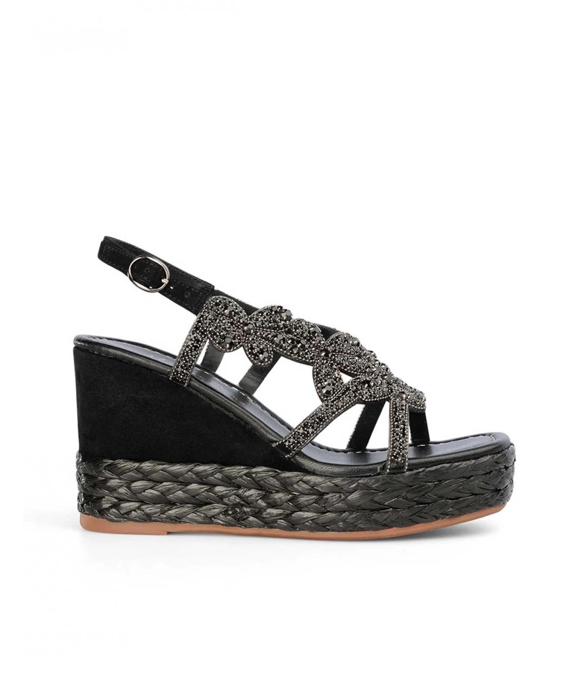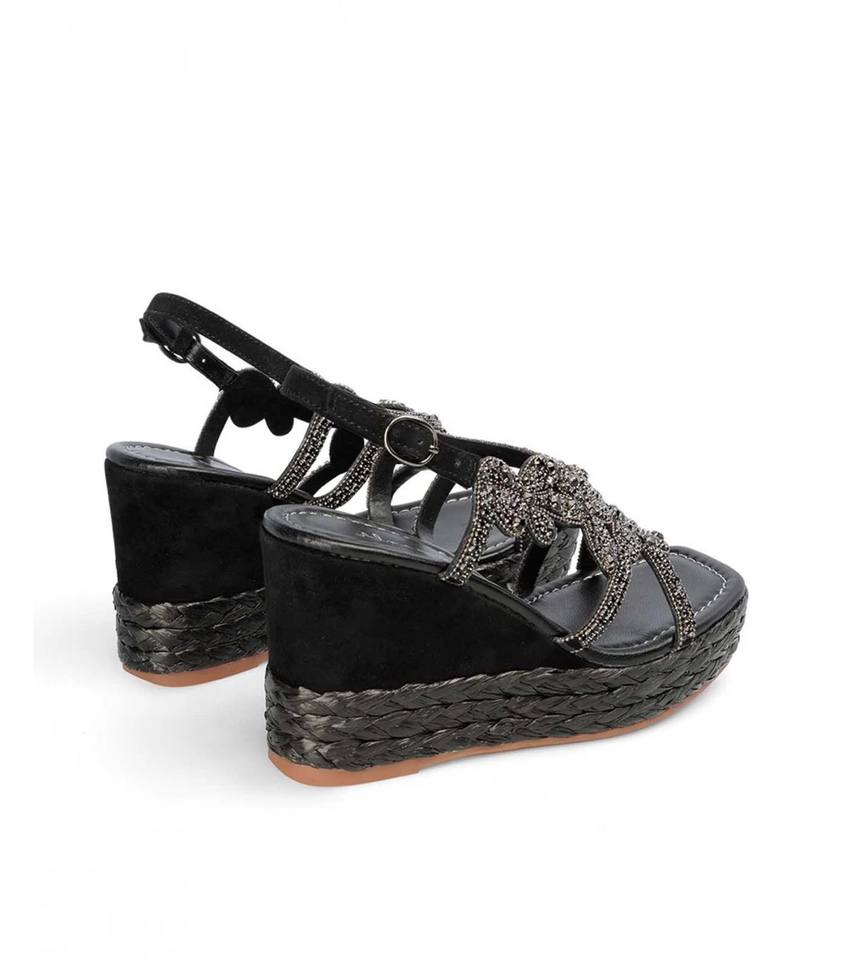 Sandalia cuña de piel con detalle trenzado y detalle de pedrería en delantero. Punta cuadrada. Cierre con hebilla en tobillo. Altura de tacón de 9,5cm.