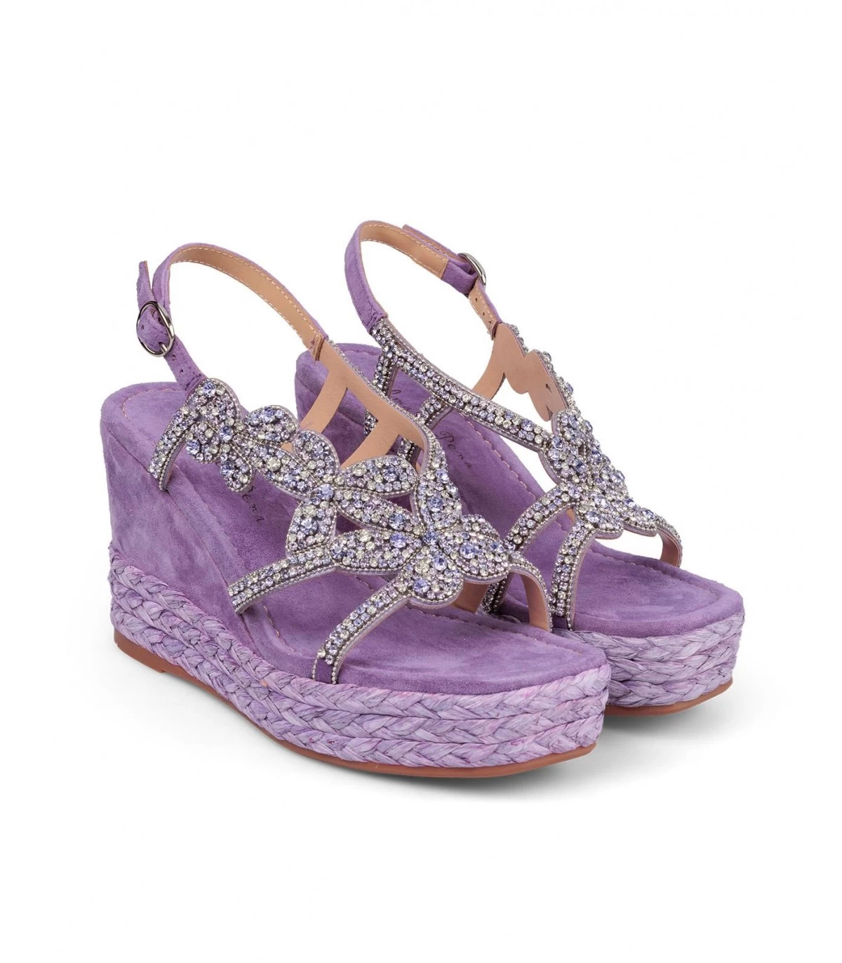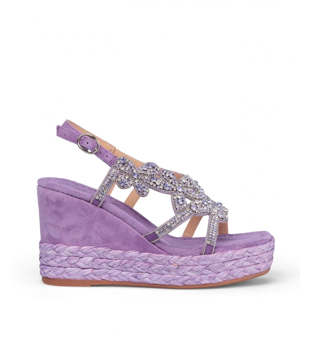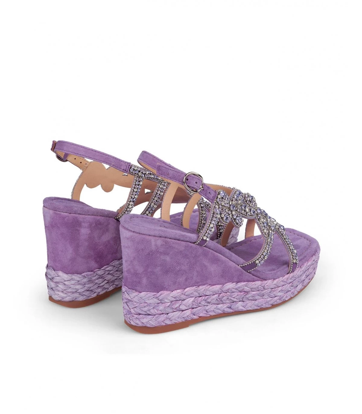 Sandalia cuña con detalle trenzado y detalle de pedrerÃa en delantero. Punta cuadrada. Cierre con hebilla en tobillo. Altura de tacón de 9,5cm.