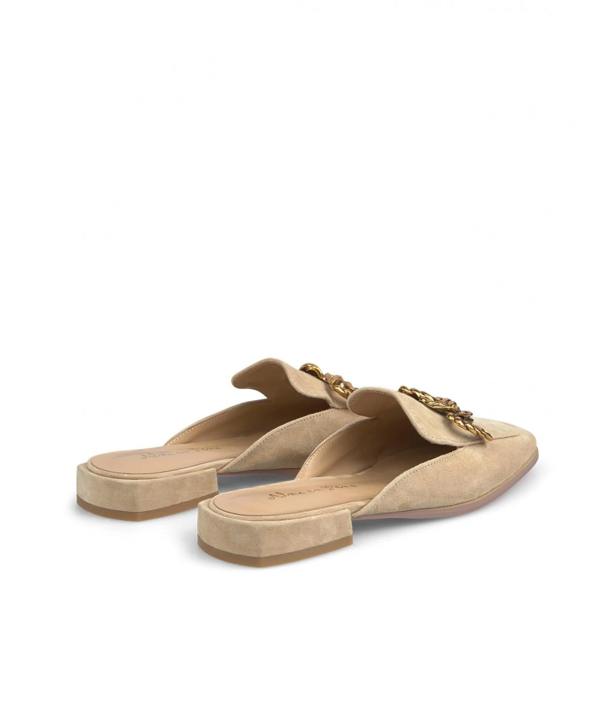 Mule de piel con adorno en dorado. Plantilla acolchada de piel. La altura del tacón es de 1cm.