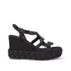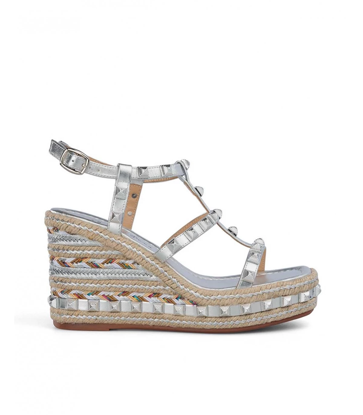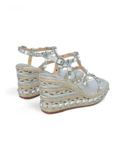 Sandalia cuña de piel con detalle trenzado y de pedrería. Punta cuadrada. Cierre con hebilla en tobillo y altura de tacón de 9,5cm